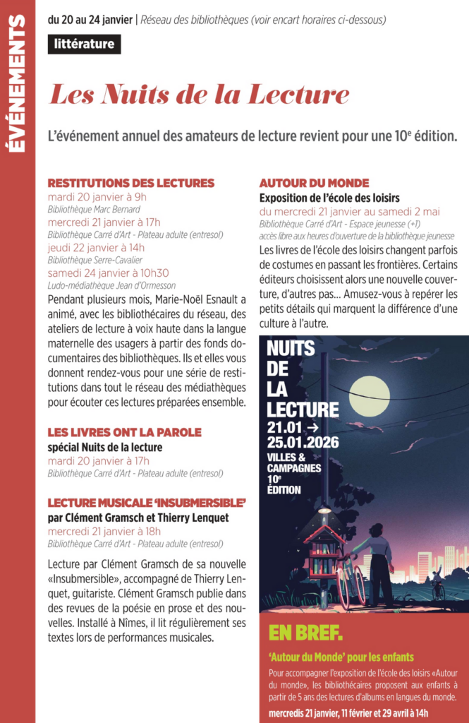- mercredi 21 janvier 2026 à 17h : Bibliothèque Carré d’Art – plateau adulte